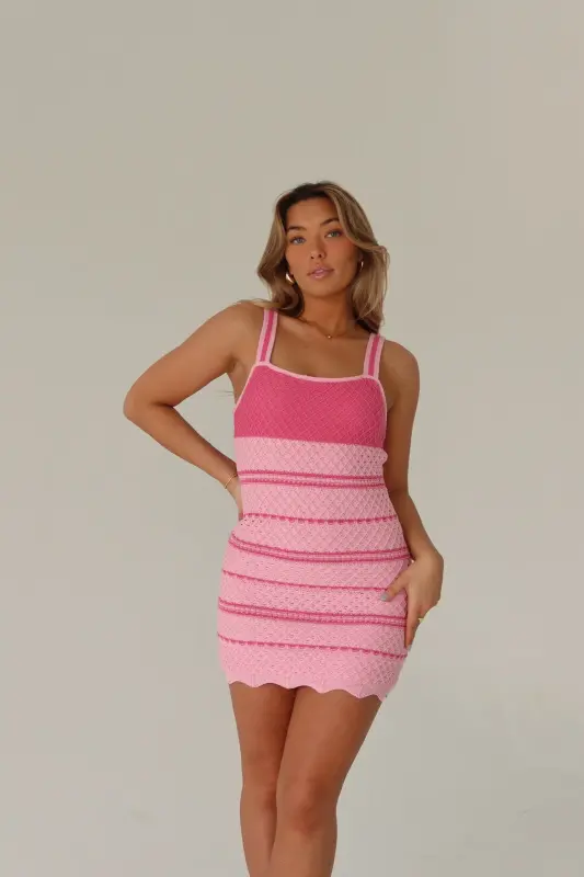 Our April Crochet Mini Dress is a captivating addition to your wardrobe. This delightful dress showcases a charming multi-pink crochet design, perfect for adding a touch of elegance to your look. Boasting a square neckline with thick straps for added comfort, it features a subtle criss-cross crochet pattern throughout, adding depth and texture. The bust is adorned with a solid pink hue, while the bodice and skirt flaunt a delightful pink and light pink stripe pattern, creating a visually appealing contrast. To elevate its allure, the hemline boasts a scalloped detail, adding a feminine touch to the ensemble. Designed to fit true to size with a comfortable stretch, this dress ensures both style and comfort for any occasion. Prepare to make a statement in the April Crochet Mini Dress and embrace effortless sophistication with every wear.