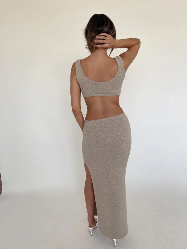 Our Brianna Knit Cut Out Maxi Dress is a knit maxi dress with unique three circle keyhole detail connecting the top and skirt of the dress. This dress features a scoop neck bra top with an open mid section with a fun three circle keyhole detail in the middle front, and an open back. The skirt of the dress is maxi length and completed with a side slit. This dress has plenty of stretch and fits true to size. This dress is perfect for any summer vacation!