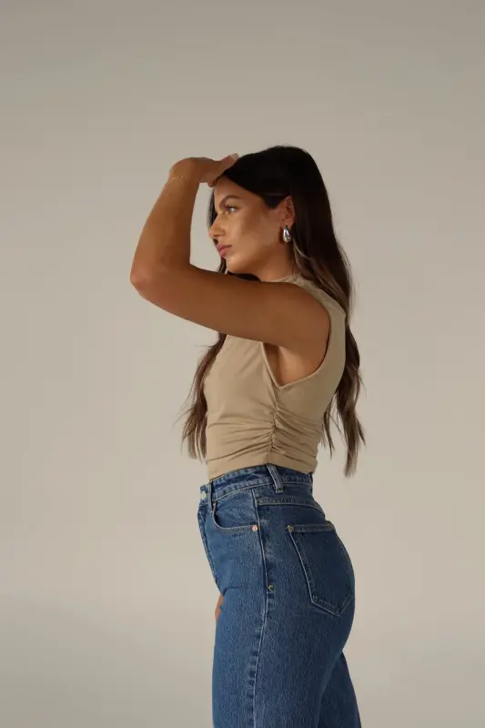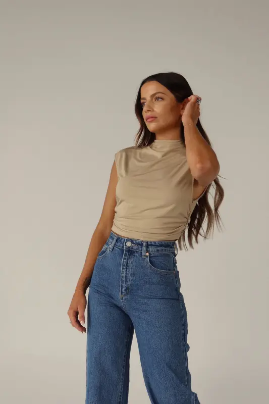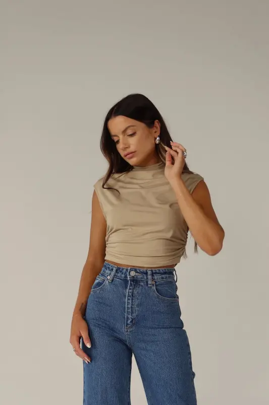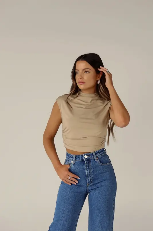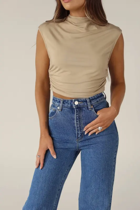 Elevate your wardrobe with this chic top featuring a mock neckline and ruched sides that flatter your figure. The cap sleeves add a touch of sophistication, while the stretchy material ensures comfort and a perfect fit. This slip-on design with a cropped length is versatile and stylish, making it a must-have for any fashion-forward wardrobe.
