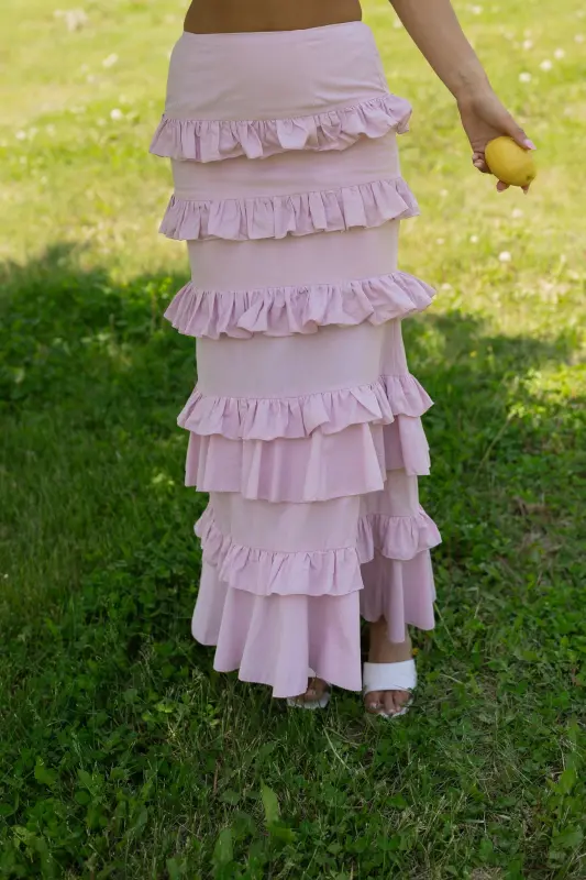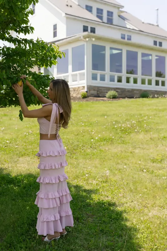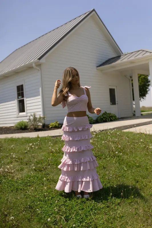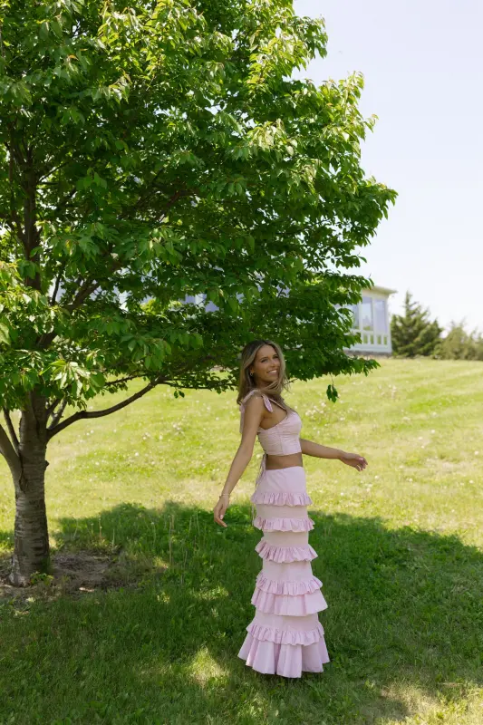 Introducing our Maeve Crop Top and Ruffle Midi Skirt Set, a standout light mauve ensemble that's both charming and sophisticated. The top features a sweetheart neckline with a corset bodice and adjustable self-tie shoulder straps, while the lace-up back adds an alluring touch. The fitted midi skirt, complete with an elastic waistband and center back zipper closure, boasts tiers of ruffle details for a playful yet elegant look.