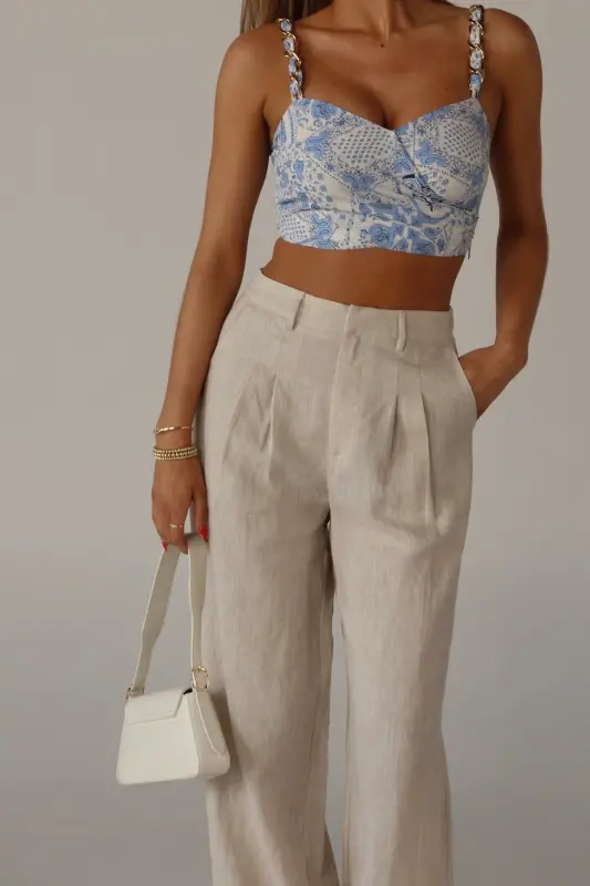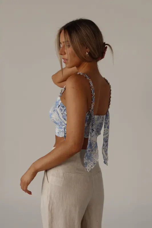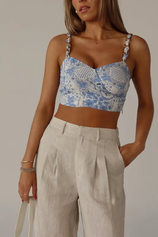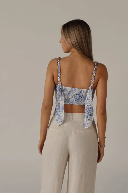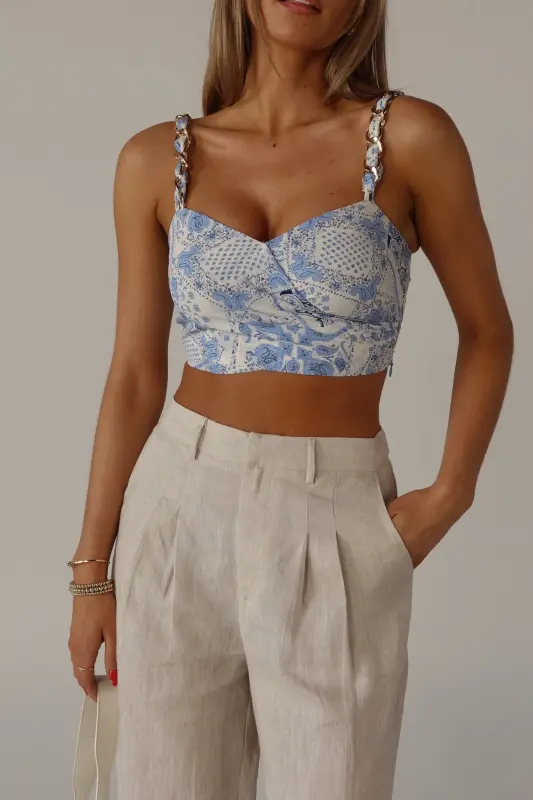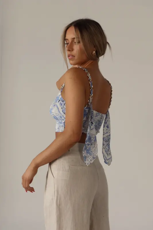 Add a touch of romance to your wardrobe with our Paige Paisley Top. This stunning piece features a sweetheart to surplice neckline, accentuating your décolletage with a flattering and elegant shape. The unique chain and ribbon straps add a sophisticated and edgy detail, perfectly complementing the delicate paisley heart print. Crafted from luxurious satin sheen fabric, this top exudes a subtle shimmer, making it ideal for both day and night occasions. Designed with a fitted body and a convenient side zipper, this cropped top ensures a sleek and tailored fit that enhances your silhouette. Pair it with high-waisted jeans, skirts, or tailored pants for a chic and versatile look.