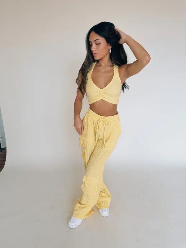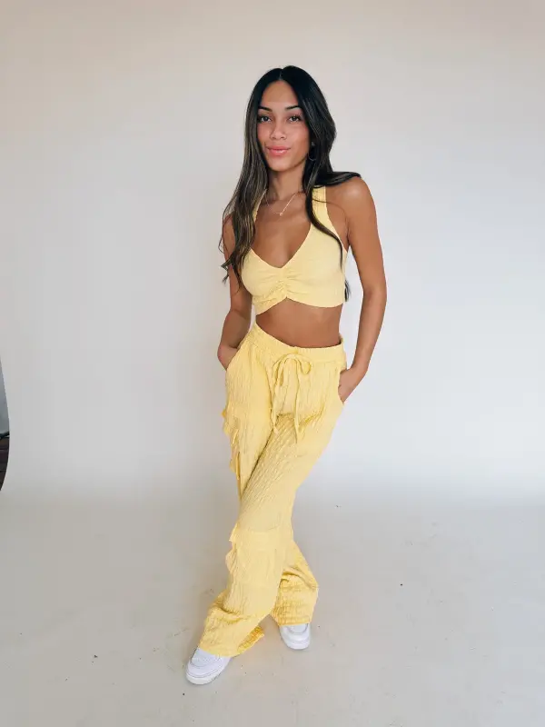 Our Winnie Crinkle Crop Top is a unique top with a crinkle texture fabric. This top features a plunging v-neck neckline, ruching detail in the center, and an asymmetrical hemline. The back of the top is completed with criss cross straps and two small buttons closure. This top can be paired as a set with the Winnie Crinkle Cargo Pants.